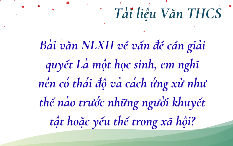 | Đề 5: Viết bài văn nghị luận xã hội về một vấn đề cần giải quyết: “Là một học sinh, em nghĩ nên có thái độ và cách ứng xử như thế nào trước những người khuyết tật hoặc yếu thế trong xã hội?” | DÀN Ý: